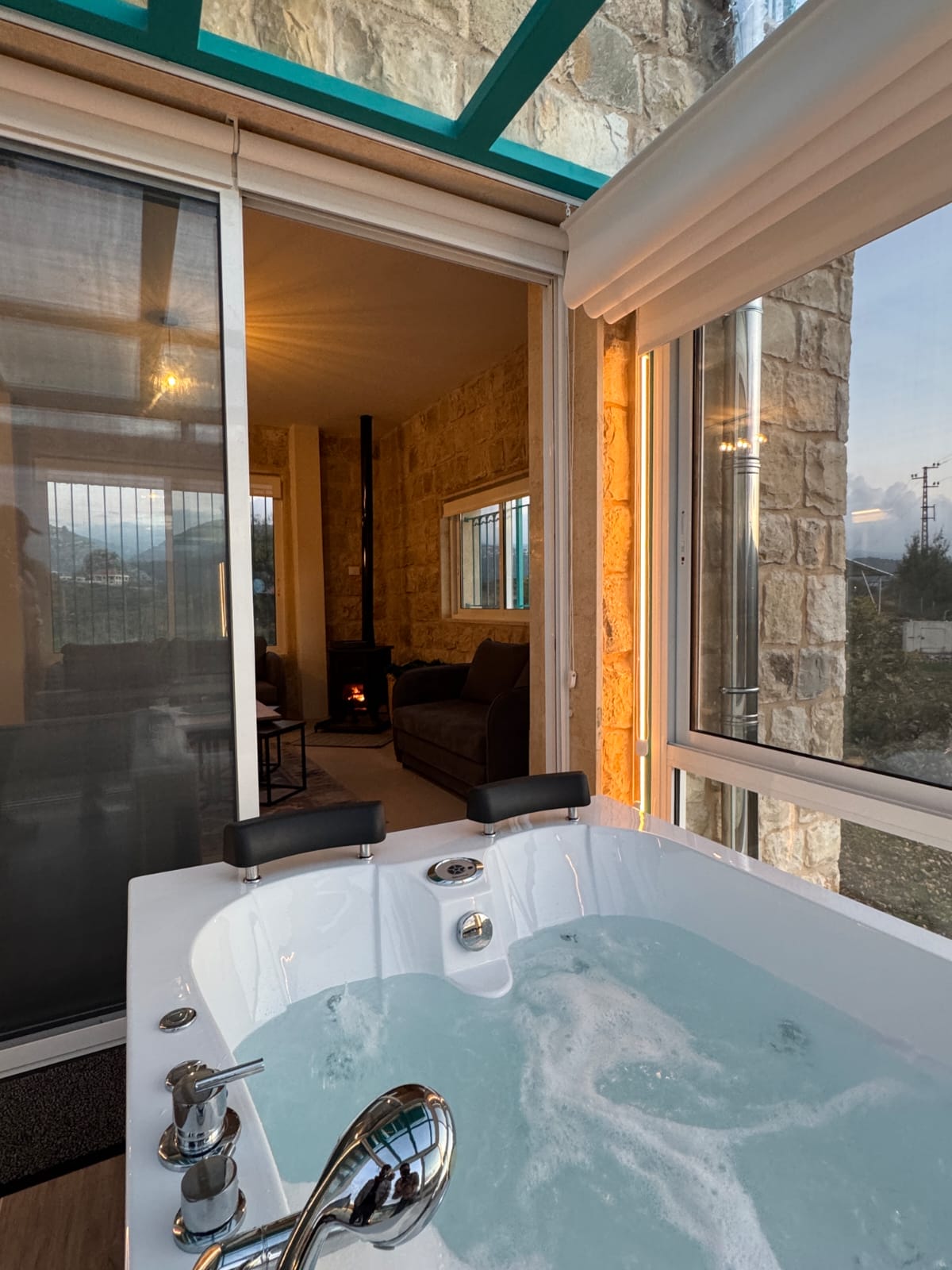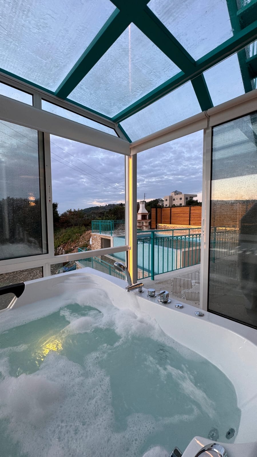 Interior jacuzzi room overlooking the mountains