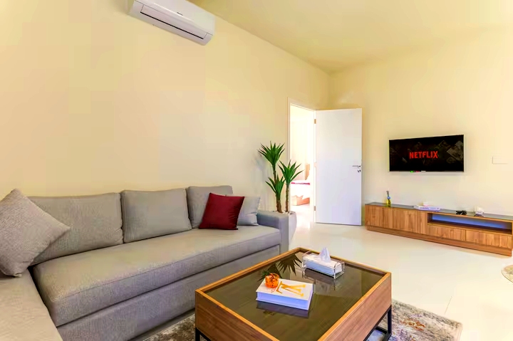 The bright living room offers a relaxing environment with a beautiful open mountain view 🏔️. As a result, you can enjoy peaceful mornings and calm evenings surrounded by natural scenery. Whether you’re watching TV, reading, or spending time with family, the space feels airy and welcoming. If you appreciate mountain views, Mar Roukoz Beirut Apartment Rental 202 is an excellent option.