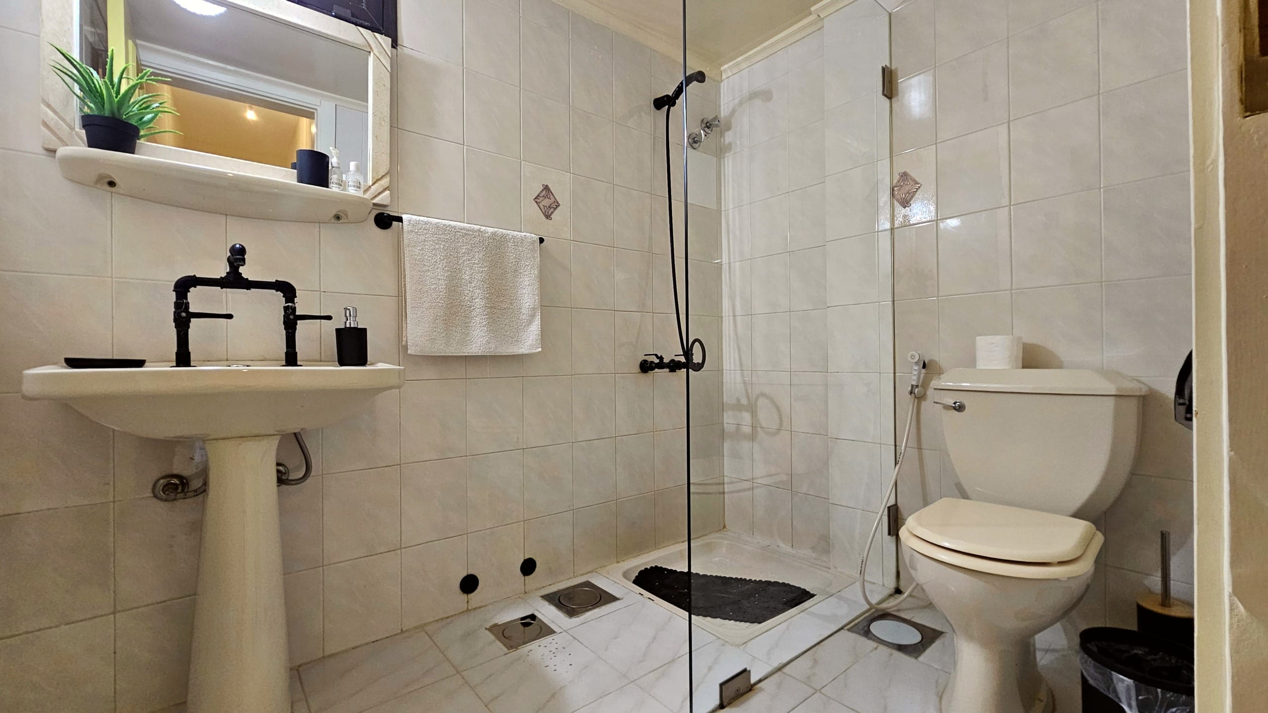 Shampoo, body soap, hand soap, towels