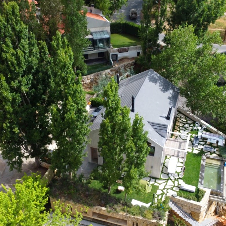 This wooden villa in Faqra is crafted for comfort, offering an ideal blend of indoor warmth and refreshing outdoor areas.